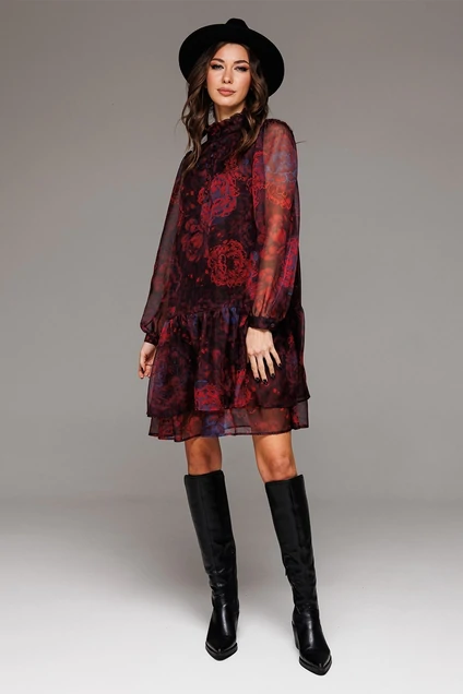 Платье А-силуэта. С втачным рукавом со сборкой по окату и внизу, на манжете с застежкой на петлю-пуговицу. По переду планка с застежкой на петли-пуговицы. Полочка и спинка с притачными воланами по низу. Платье на подкладке. Воротник стойка с рюшей.