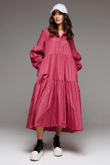 Платье А-образного силуэта, отрезное выше линии талии, с рукавом реглан внизу со сборкой и манжетой на завязке. Перед с центральной застежкой на петли-пуговицы до подреза. Низ платья из слегка присборенных воланов. Воротник рубашечный отложной на стойке. Спинка длинее переда.