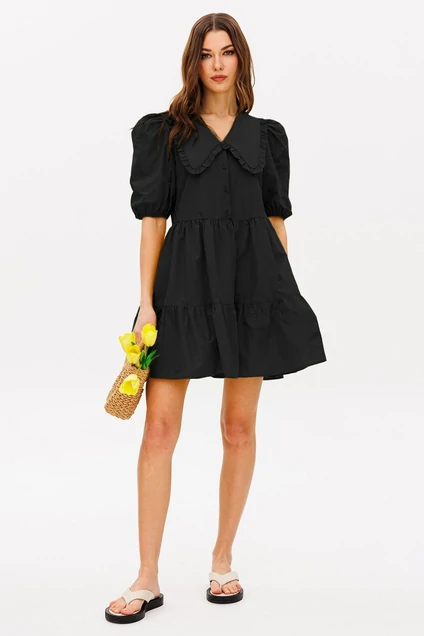 Платье А-образного силуэта, отрезное по линии талии. Рукав втачной короткий со сборкой по окату и внизу на резинке. По переду лиф с центральной застежкой на петли пуговицы. Полочка и спинка с притачным слегка присборенным воланом по низу. Платье с воротником с рюшей. Без подкладки.