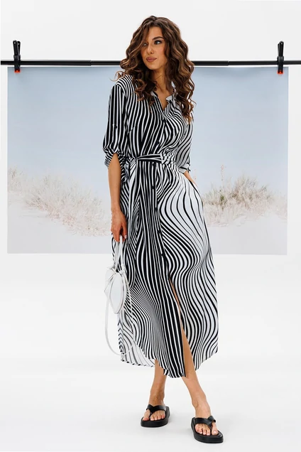 Платье прямого силуэта, со спущенной линий плеча. Рукав втачной, длиной 7/8, который можно подвернуть и застегнуть на пату. Полочка отрезная по линии талии и с центральной застежкой на петли-пуговицы по цельнокроеной планке. Платье с поясом из основной ткани в боком шве и со складками переходящими в пояс по левой половинке. Платье с карманами в боковых швах и фигурным низом. Воротник стойка. Внизу по боковым швам обработаны разрезы.