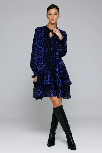 Платье А-силуэта. С втачным рукавом на резинках внизу. Полочка и спинка с притачными воланами по низу. Платье на подкладке. Воротник-стойка переходящий в завязку спереди. Горловина округлая с вырезом-каплей по переду.