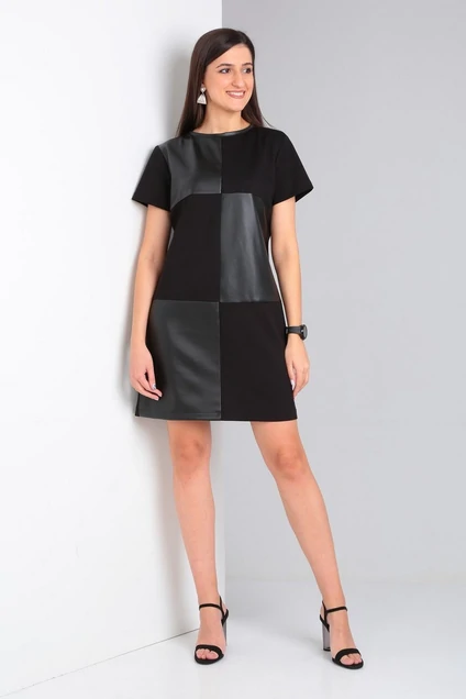 Короткое комбинированное платье из экокожи и трикотажа от Celentano.
