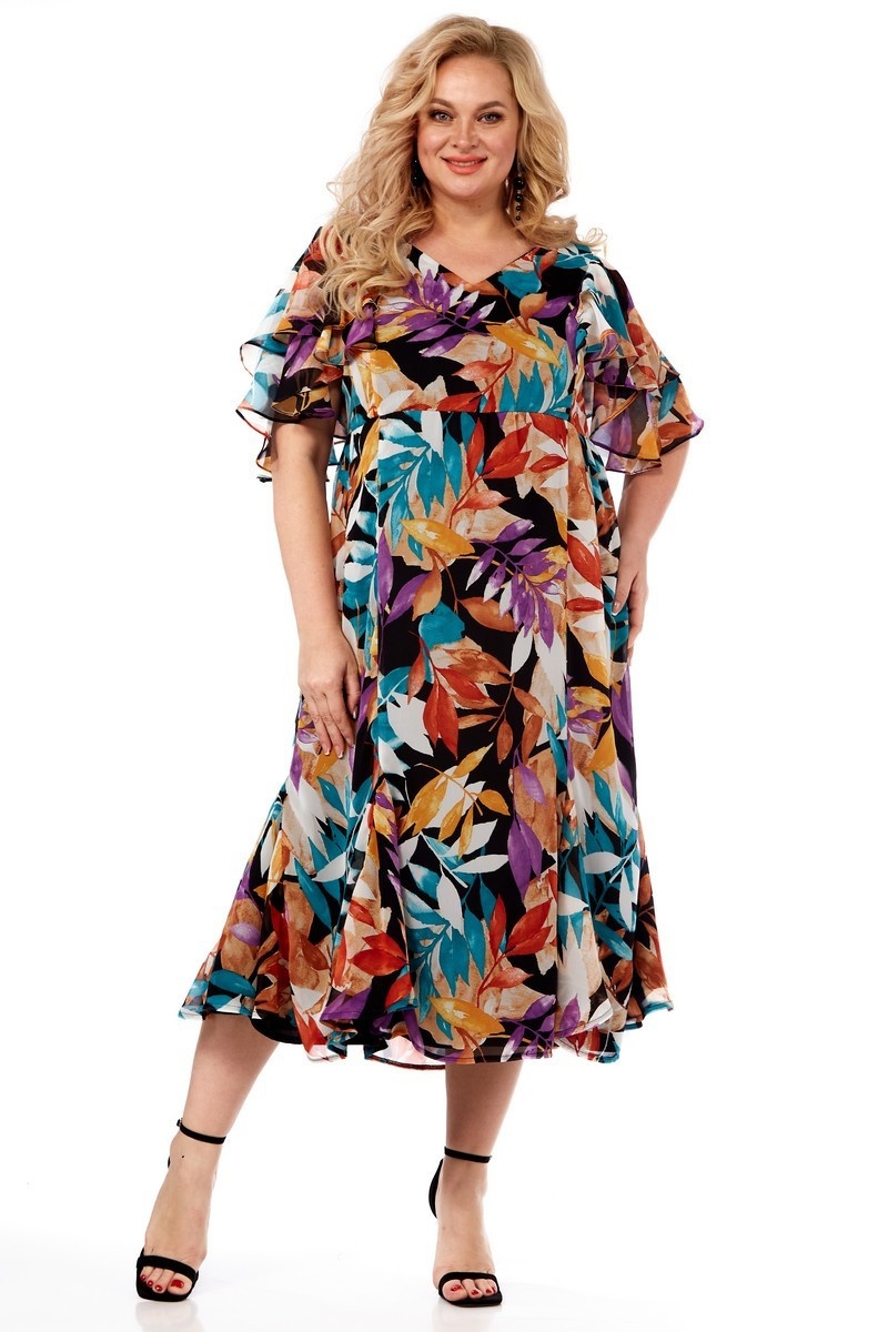 По полочке и спинке V-образный вырез и подрез чуть выше линии талии. По низу полочки и спинки вставлены клинья. Двойной волан имитирует рукав. Платье на текстильной вискозной подкладке.