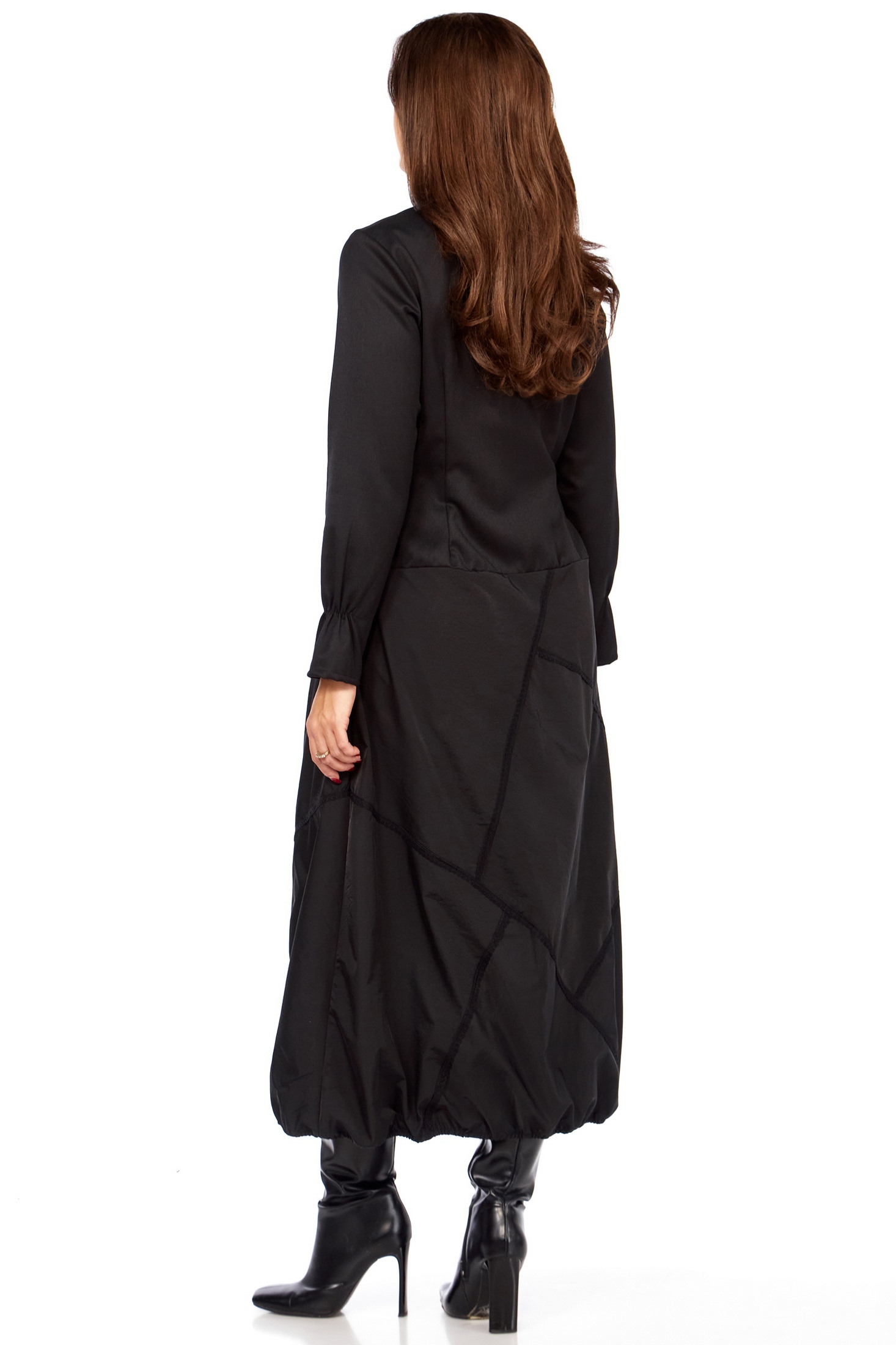 • Силуэт: Прямой, слегка расширяющийся к низу. Модель предполагает свободную посадку по фигуре. Нижняя часть платья имеет сложный крой, создающий эффект "баллона" или асимметричного многослойного объема.