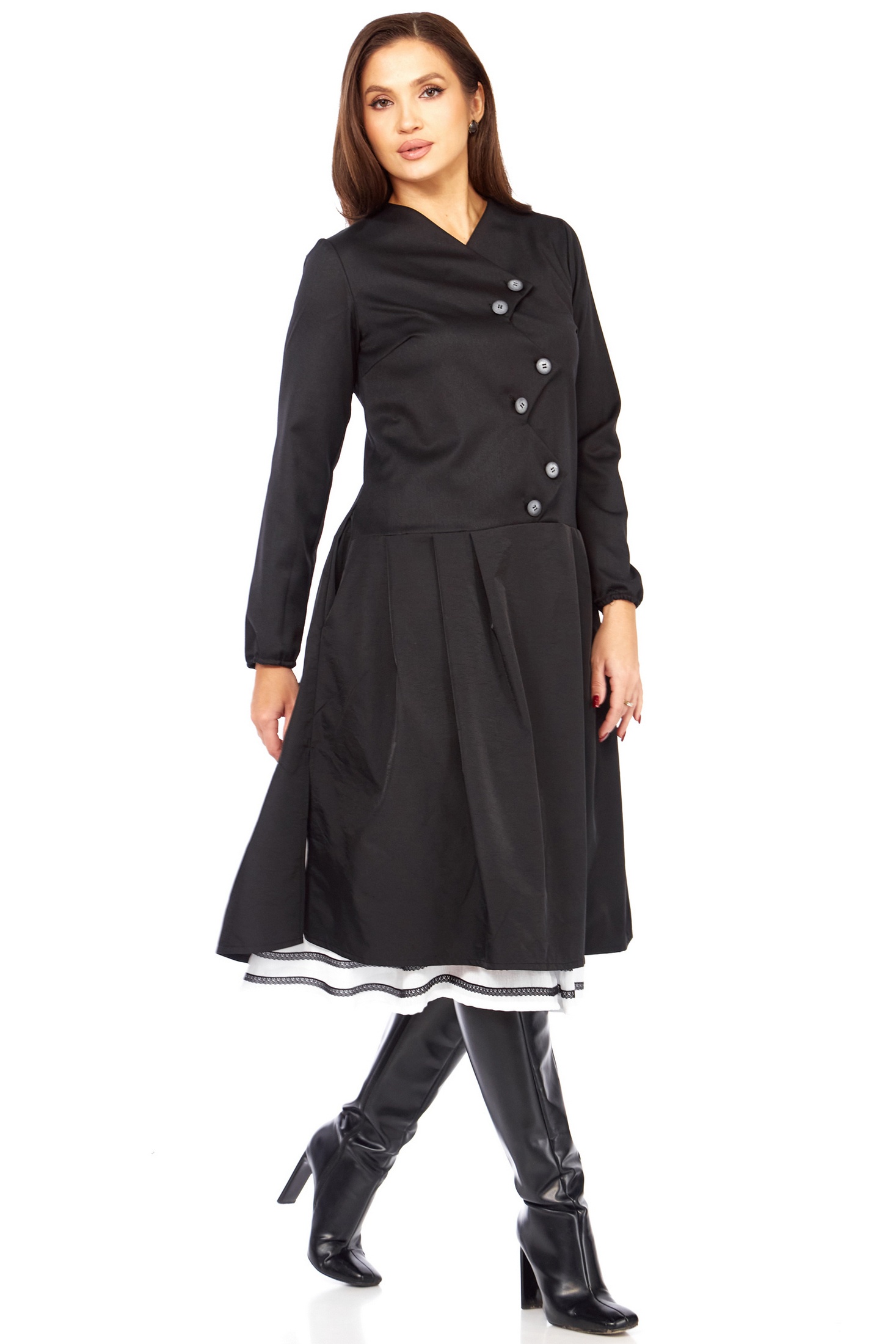 Особый шарм платью придает асимметричная застежка на крупные пуговицы, которая выгодно подчеркивает линию шеи и создает необычный акцент. Удобный крой и качественная ткань гарантируют, что вы будете чувствовать себя комфортно и уверенно в любой ситуации.