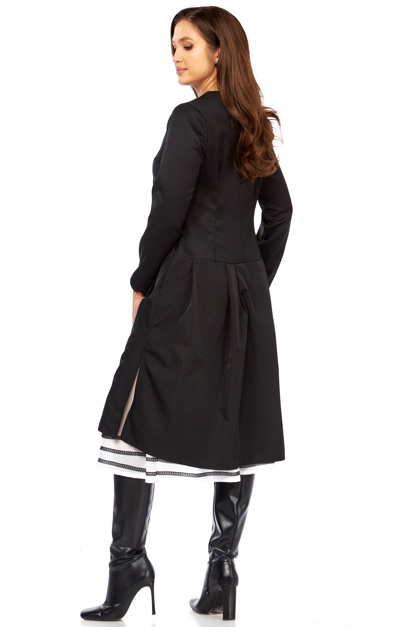 Это не просто платье, это стильный дуэт в одном флаконе, искусно имитирующий многослойный комплект. Глубокий черный цвет верхнего платья с приталенным лифом и изящными складками на юбке создает утонченный силуэт. А высокие боковые разрезы игриво открывают взгляду контрастную белую юбку-компаньон, украшенную графичными черным кружевом по низу. Этот эффект — настоящий магнит для взглядов!