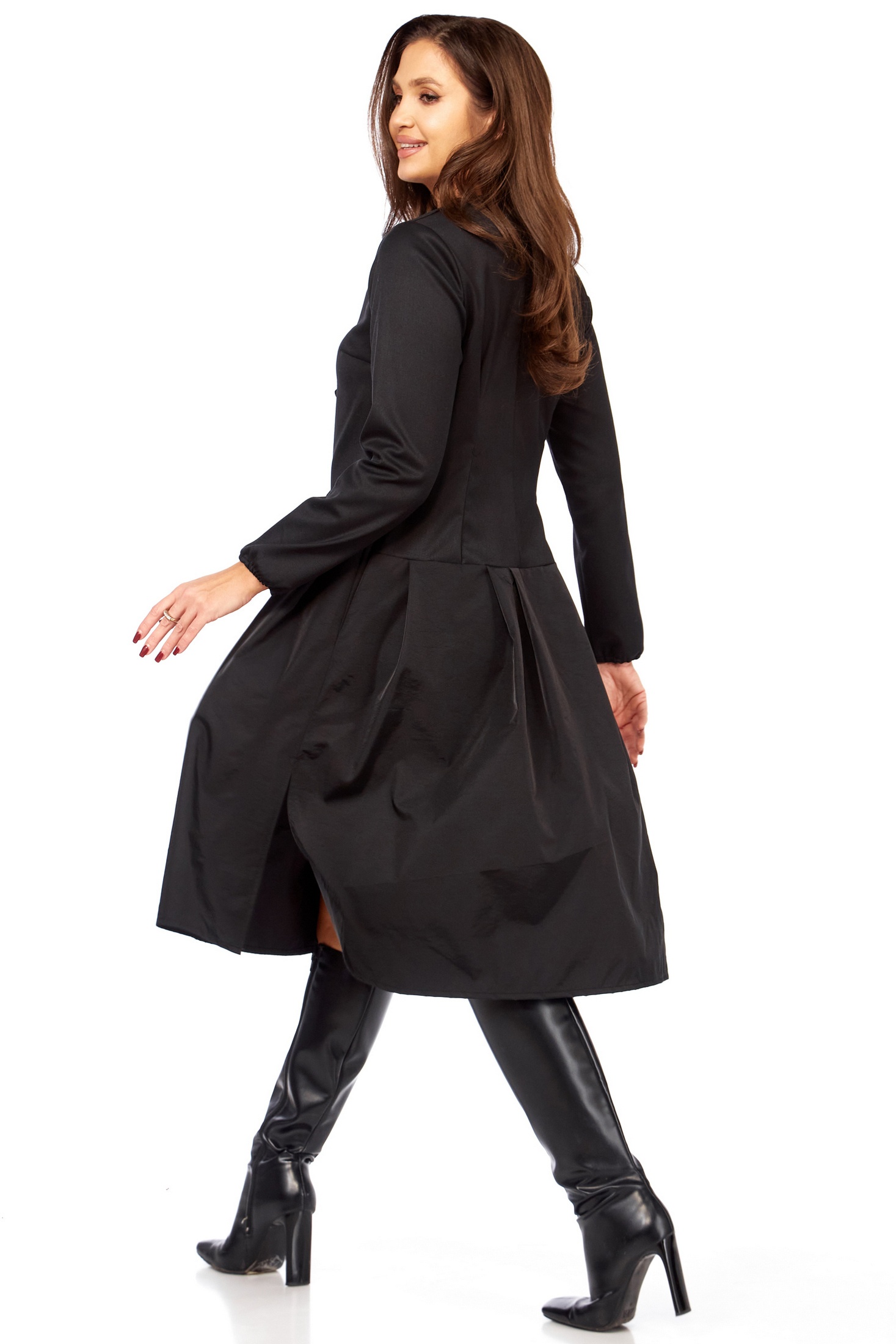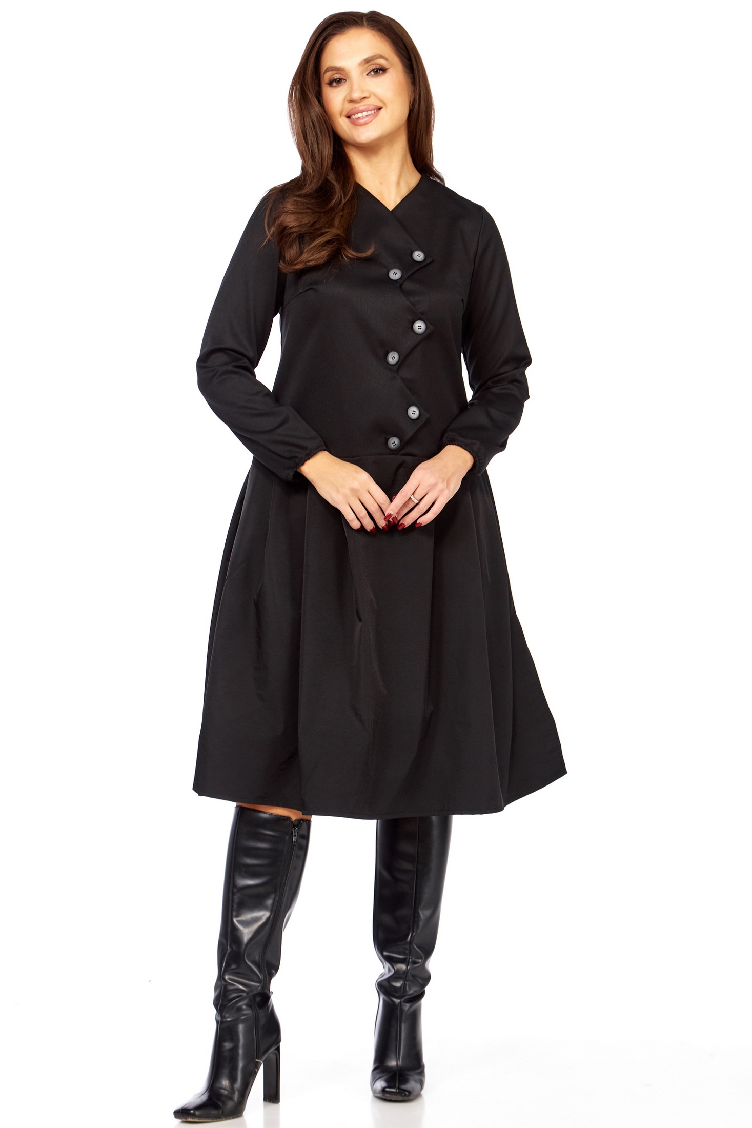 Это платье в глубоком черном цвете — настоящая находка для тех, кто ценит универсальность без компромиссов в стиле. Оно одинаково великолепно смотрится с лодочками для делового мероприятия, с ботильонами для похода в театр или с высокими сапогами для осенней прогулки.