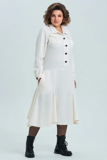 Застежка центральная на петли и пуговицы, воротник втачной отложной. По передней части платья и спинке идет подрез ниже линии талии, низ платья с клиньями годе. Перед с нагрудными вытачками и двумя карманами с клапаном. По переду платья от подреза идут функциональные карманы хулиганы. Спинка разрезная с центральным швом и талиевыми вытачками. Рукав длинный одношовный втачной с притачной манжетой снизу. Застегивается на пуговицу.