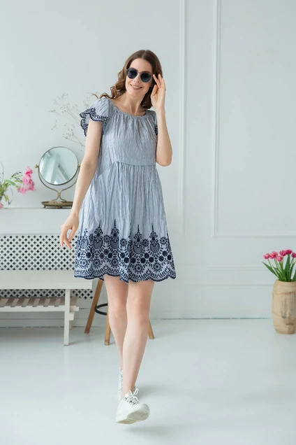 Платье расширенного силуэта с коротким рукавом из текстильного хлопка с бордюрной вышивкой. Горловина расширенная с резинкой по краю. По переду диагональные карманы в шве с и горизонтальный подрез с декоративной складкой и сборкой. По спинке полурельефы, по центральной части декоративная складка и сборка. Длина 83 см.