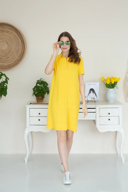 Платье прямого силуэта с коротким рукавом. Горловина округлая с рубашечным воротником. Застежка по переду на планку и петли-пуговицы. По детали переда декоративная застрочка защипами. По спинке V-образный вырез. Рукав со сборкой по окату.