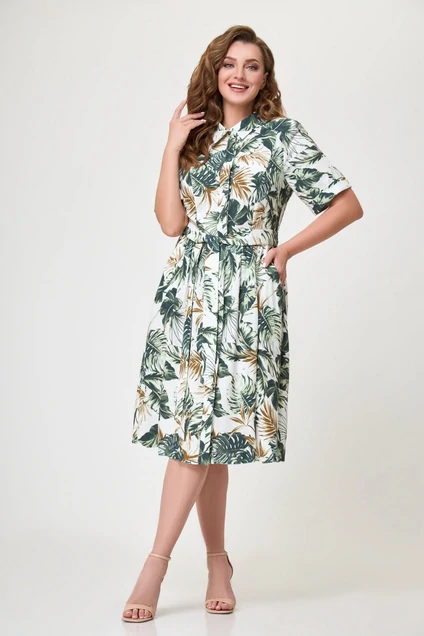 Это платье средней длины с принтом в тропическом стиле, который представляет собой реалистичные изображения зеленых листьев пальмы на светлом фоне. Ткань кажется легкой и воздушной, что делает платье идеальным выбором для летнего гардероба или отпуска в теплом климате.