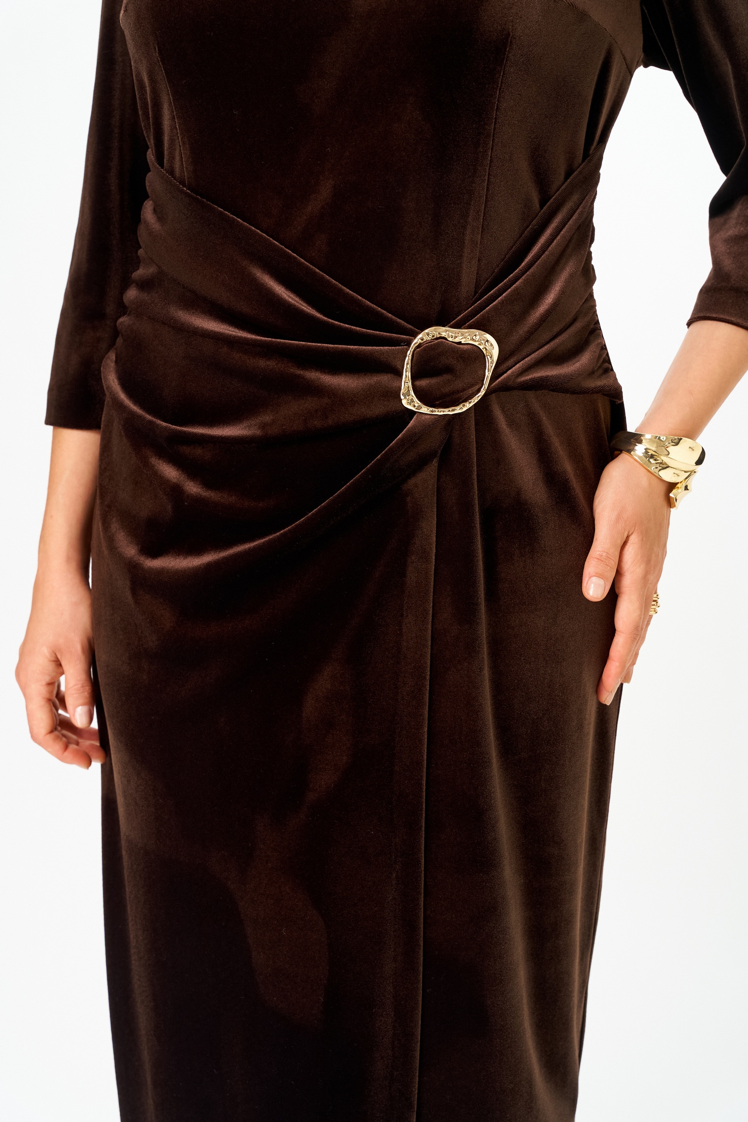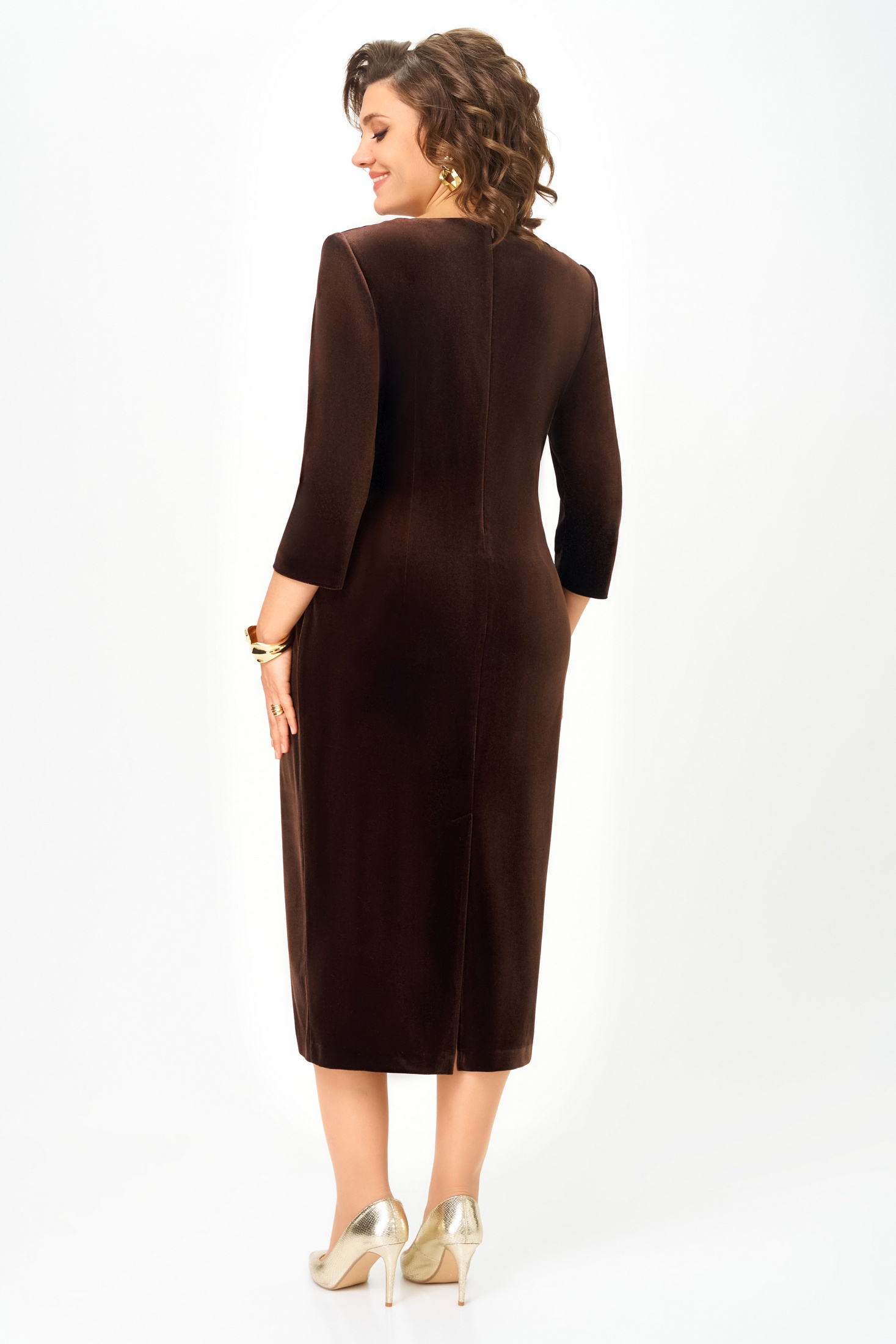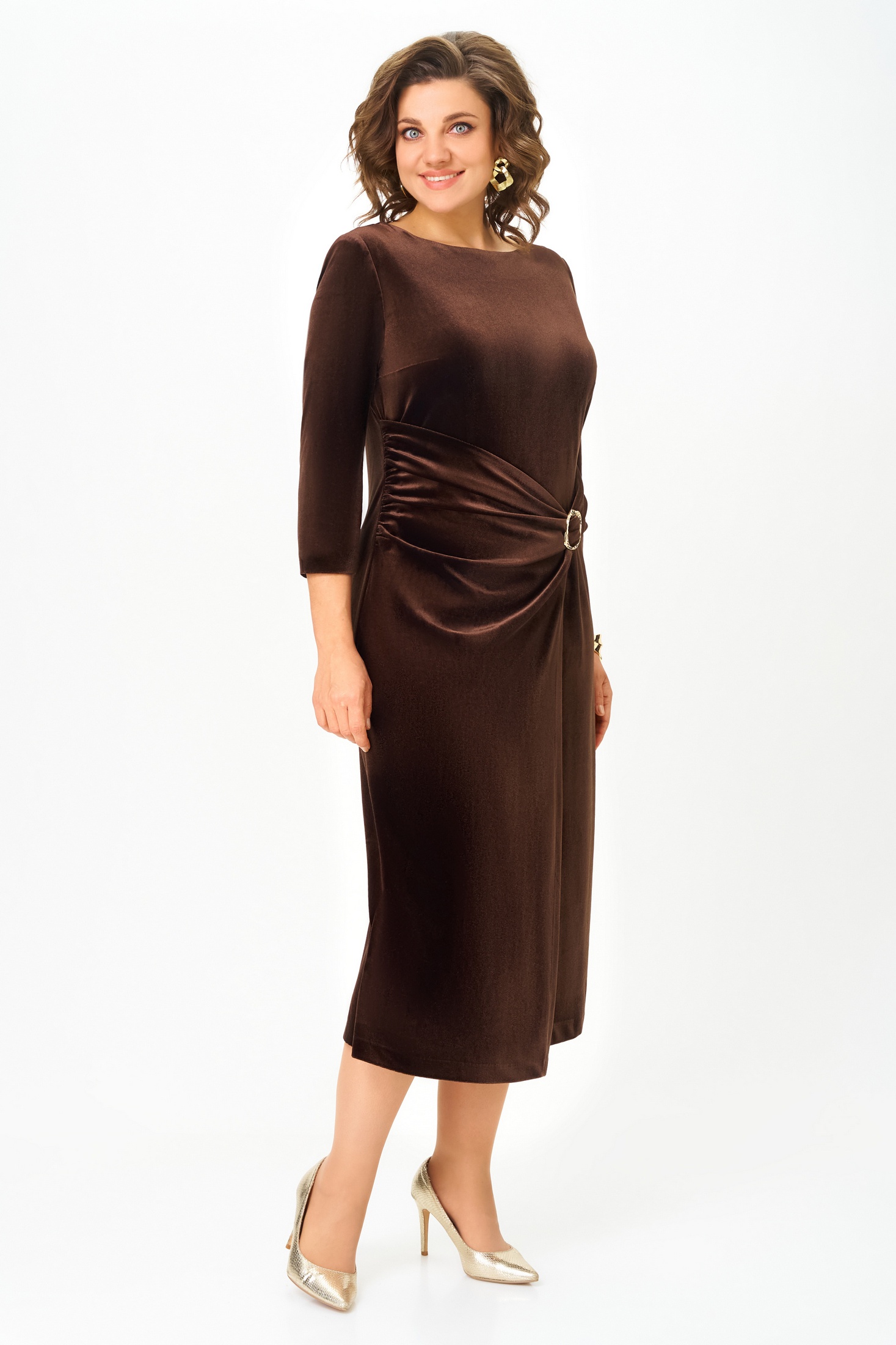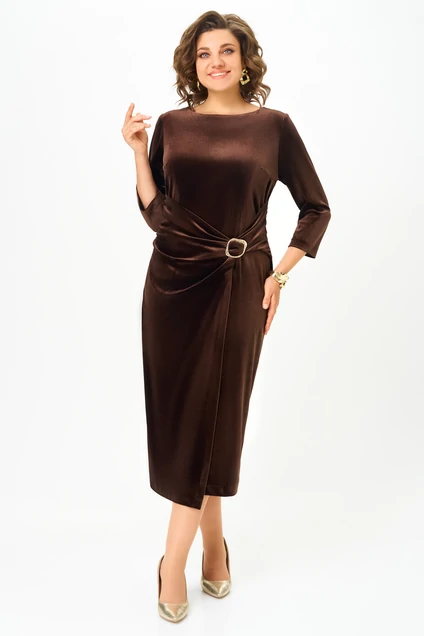 Платье женское прилегающего силуэта, длиной до середины икры, зауженное к низу. По переду: таллиевые и нагрудные вытачки, отделочная отлетная деталь в области талии и бедер, декорированная пряжкой . По спинке: центральный шов с потайной молнией в верху и высокой шлицей внизу, таллиевые выточки вырез горловины в виде «лодочки»