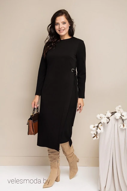 Платье полуприлегающего силуэта в сочетании трикотажа и лапши. Перед с нагрудными и талиевыми вытачками, с наклонным подрезом,оформленным складкой и притачной деталью из лапшовой ткани. Фиксация на пояс через люверс. Спинка со средним швом и талиевыми вытачками. Застежка на молнию в шве. Горловина округлой формы. Рукав втачной. Низ платья асимметричный.