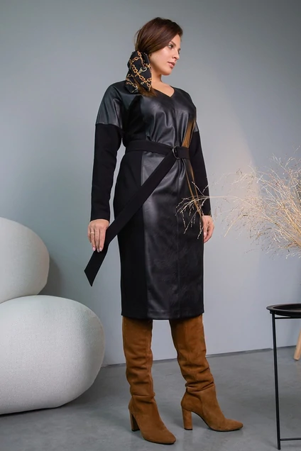 Платье Х-силуэта из экокожи с V-образным вырезом горловины. Бочки лифа и юбки выполнены из контрастной ткани. Платье отрезное по талии. Пройма спущена. Рукав втачной, из контрастной ткани. Длина изделия ниже колена. Вид застежки- молния по спинке. Длина изделия до талии 40 см. Длина изделия по спинке- 110 см. Без подкладки. Покрой- полуприлегающего силуэта.