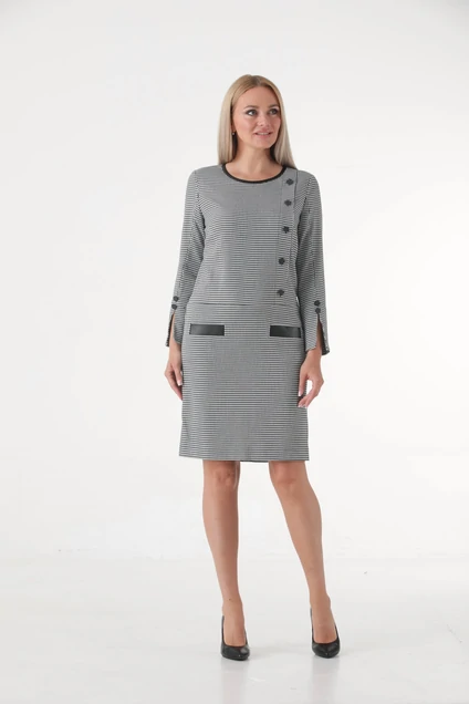 Элегантное платье полуприлегающего силуэта из мягкого эластичного текстильного полотна в трендовом дизайне - «гусиная лапка». Округлая горловина с кантом из эко-кожи, спинка со средним швом и талиевыми вытачками. В среднем шве спинки расположена застежка на длинную потайную молнию, внизу шлица. По переду нагрудные вытачки, с левой стороны планка с имитацией застежки на пуговицы. Линия талии отрезная, чуть занижена, на уровне линии бедра расположены прорезные горизонтальные карманы с листочками из эко-кожи. Рукав втачной длинный с передним швом, внизу глубокий разрез с отделочными пуговицами. Платье без подкладки. Модное универсальное платье весьма гармонично в элегантном образе современной леди.
