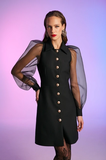 Платье, из ткани костюмно-плательного ассортимента, в сочетании с матовой органзой, отрезное по линии талии. Платье длиной выше линии колена, с втачными рукавами длиной до запястья, с «американской» линией проймы, со стояче-отложным воротником с вытянутыми концами. Застёжка платья однобортная на петли и пуговицы. Лиф прилегающего силуэта, передние половинки с талиевыми вытачками и рельефами. Спинка со средним швом и талиевыми вытачками. Нижняя часть платья слегка расширена. Рукава «буфы», из прозрачной органзы, со сборкой в верхней части оката и по шву притачивания манжет. Застёжка манжет на петлю и пуговицу. Платье на подкладке.