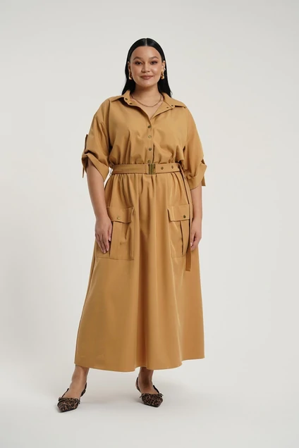 Платье женское свободного покроя. Воротник рубашечный. Застежка на кнопки до линии талии. Рукав отрезной на базе цельнокроеного с патой. По линии талии отрезное с эластичной тесьмой. По переду юбки карманы-портфели с клапанами. Изделие дополнено съемным поясом с пряжкой и кнопками.