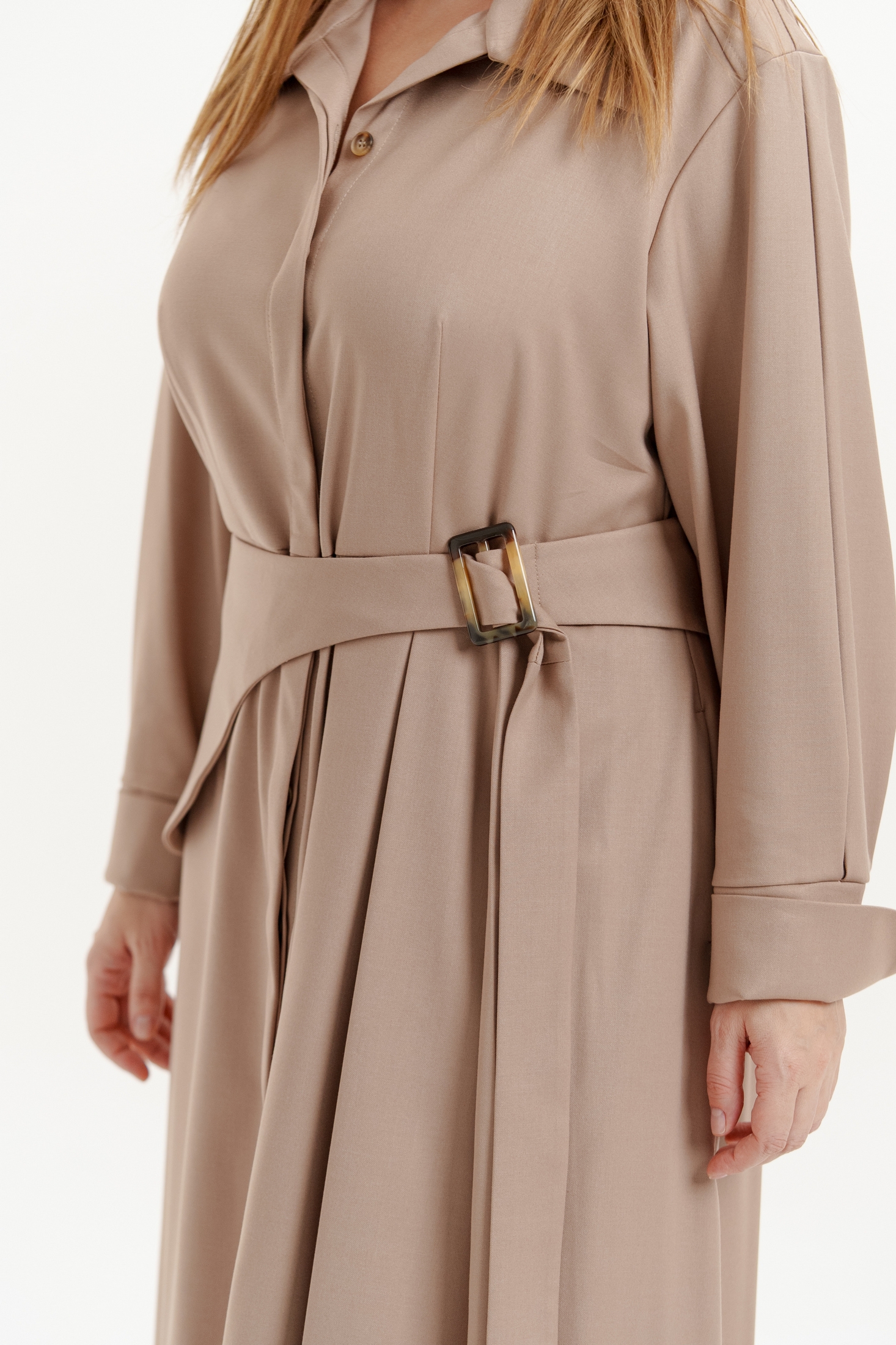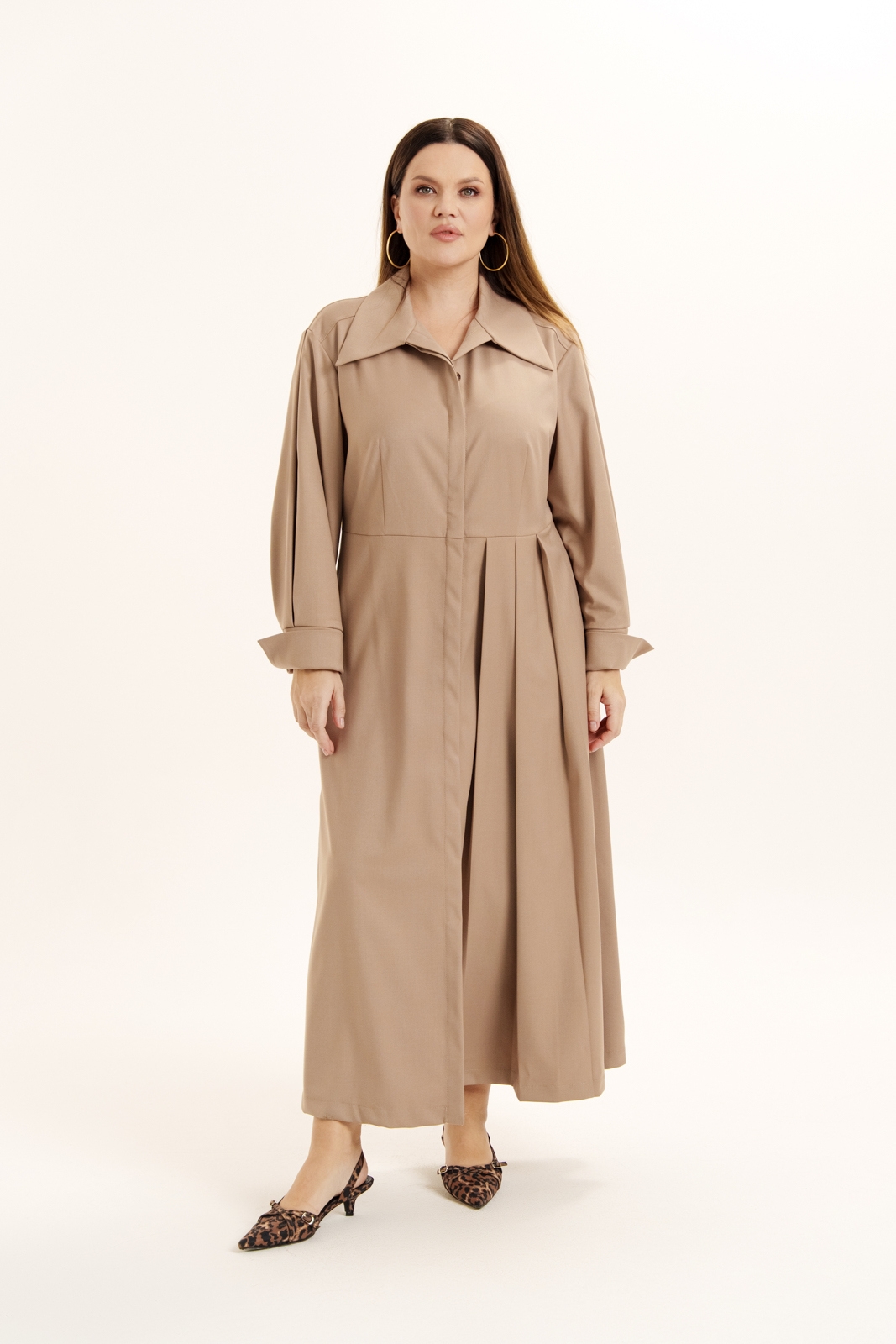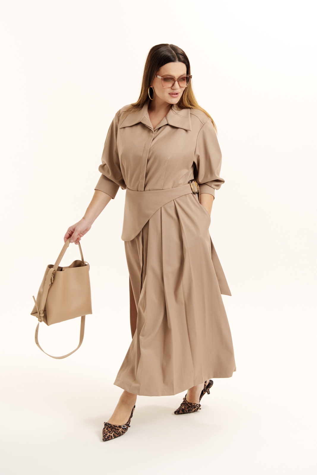 Платье 1295 Deesses — это воплощение элегантности и комфорта. Коллекция бренда Deesses предлагает приталенный силуэт с изысканным дизайном, выполненным из костюмной ткани, что придаёт изделию прочность и долговечность. Платье имеет воротник рубашечного типа и скрытую застежку с пуговицами, что делает его идеальным вариантом для офисного или повседневного стиля. Карманы в боковых швах и съемная баска добавляют практичности и изящества. Разрез справа и складки слева подчёркивают женственность. Бежевый цвет и длина в пол придают универсальность, делая его идеальным для осеннего и весеннего гардероба. Это платье отлично подойдёт как на каждый день, так и для более формальных мероприятий.