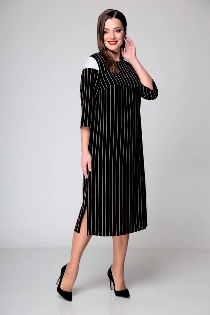 Платье выполнено из ткани в полоску с отделкой из контрастного цвета. Плетье прямого силуэта с поясом. Воротник отложной на стойке. Застежка на петлю и пуговицу сзади. Рукав длинный, в верхней части с отделкой. По бокам разрезы.