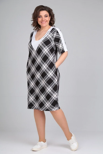 Платье женское полуприлегающего силуэта.Спинка и перед с округлыми бейками из отделочной ткани по горловине. Рукав втачной с полосой по середине из отделочной ткани. Горловина переда V-образная с отрезной отделкой. Низ рукава и низ изделия с отделочной строчкой-3 см.
