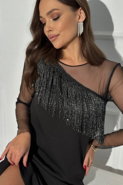 Перед с нагрудными вытачками из бокового шва и ассиметричной кокетка из ткани-сетка. По шву притачивания кокетки и правому плечевому шву настрочена декоративная тесьма- бахрома.