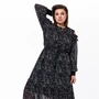 Платье из струящегося шифона длиной maxi на вискозной подкладке. Длина изделия по спинке 140см. Рукав длиной 66см на трикотажной манжете 9см. Верх рукава на резинке с рюшей, по плечам небольшие вырезы. По низу изделия притачной волан на сборке. По спинке застёжка на петлю и пуговицу по горловине. Платье на резинке по талии. Комплектуется ремнём. Длина изделия - 140 см. Длина рукава - 66 см. Длина манжета - 9 см.