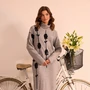 Стильное трикотажное женское платье из мягкого трикотажного полотна, модель полуприлегающего силуэта, со спущенным рукавом. В боковых швах присутствуют карманы. Перед платья декорирован дизайнерской вышивкой.