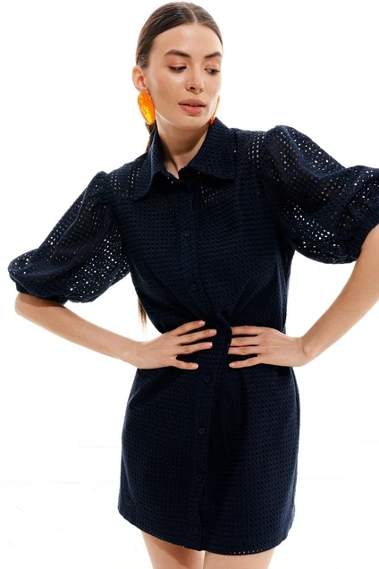 Платье женское, прямого силуэта, длиной выше линии колен из хлопковой плательно-блузочной ткани с декоративной вышивкой (ришелье). Перед с нагрудными вытачками, центральной планкой и застежкой на петли, пуговицы. Рукав одношовный, втачной, длиной до линии локтя, присборенный по окату, по низу присборен на притачную манжету с резинкой. Воротник рубашечный на отрезной стойке. Платье на подкладке. Длина 82 см, рукав 33 см.