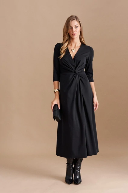 Платье полуприлегающего силуэта длиной миди из плательной ткани. Изделие с отрезным лифом. По переду декоративный элемент в виде драпировки. Спинка со средним швом, талиевыми вытачками. Горловина V- образная. Рукав укороченый втачной.