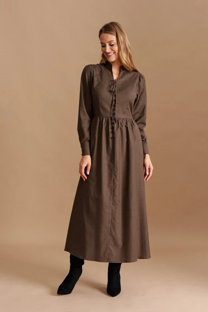 Платье женское, приталённого силуэта из хлопковой плательной ткани, длиной макси, отрезное по линии талии. Лиф переда с талиевыми вытачками V-образным вырезом горловины, средним швом и имитацией застёжки с декоративными пуговицами. Лиф спинки с талиевыми вытачками. Юбка платья присборенная, со средним швом спереди. Рукав длинный, со сборкой по окату и снизу, на притачном манжете. Горловина обработана воротником-стойкой с декоративной завязкой. декоративные завязки есть и в боковых швах.