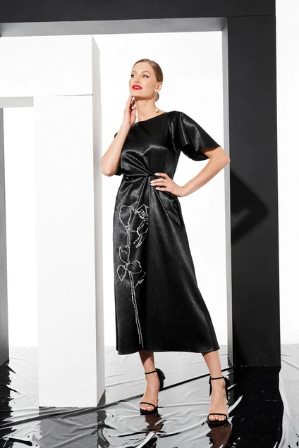 Платье полуприлегающего силуэта длиной миди из плательной ткани. По переду декоративный элемент в виде драпировки и вышивки. Спинка с талиевыми вытачками, молния в боковом шве. Горловина округлая.Изделие с втачным рукавом до линии локтя.