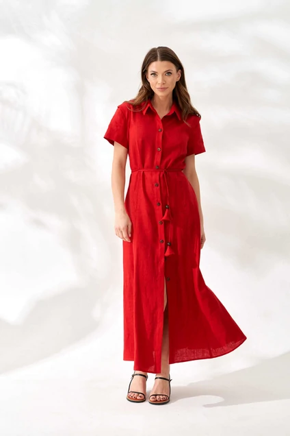 Платье женское из льняной плательно-костюмной ткани, прилегающего силуэта, расклешенное от линии бедер книзу, длиной макси, с центральной застежкой на петли и пуговицы. По полочкам и спинке рельефы от плеча и до низа. По спинке средний шов. В боковых швах карманы. Рукав втачной одношовный короткий. Проймы по окату частично обтачаны обтачкой, в которую втачан рукав. Воротник рубашечный отложной на притачной стойке. На платье по талии завязывается поясок-шнурок из основной ткани с кисточками и деревянными бусинами.