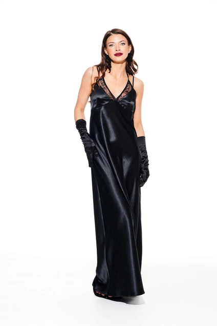 Элегантное макси-платье чёрного цвета представляет из себя идеальный выбор для торжественного вечера. Модель выполнена из гладкого блестящего материала, который эффектно подчеркивает силуэт. Лиф платья украшен кружевными вставками на чашках треугольной формы, обеспечивая изысканный акцент. Регулируемые бретели позволяют идеально подогнать платье по фигуре. Нижняя часть выполнена без дополнительных украшений, что подчеркивает струящуюся линию материала и добавляет изящества образу. Это платье - превосходный выбор для создания непревзойденного вечернего образа.