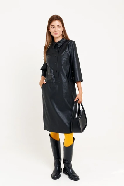Платье женское, прямого силуэта, длиной ниже линии колен из эко кожи. Отрезное ниже линии талии. Перед с широкой отделочной планкой с застежкой на кнопки, нагрудными вытачками, с прорезными функциональными карманами с листочками, листочки с настрочными концами. Спинка со средним швом до подреза. Рукав втачной, длиной три четверти. Отложной рубашечный воротник на стойке. Длина 102 тсм, рукав 43 см.