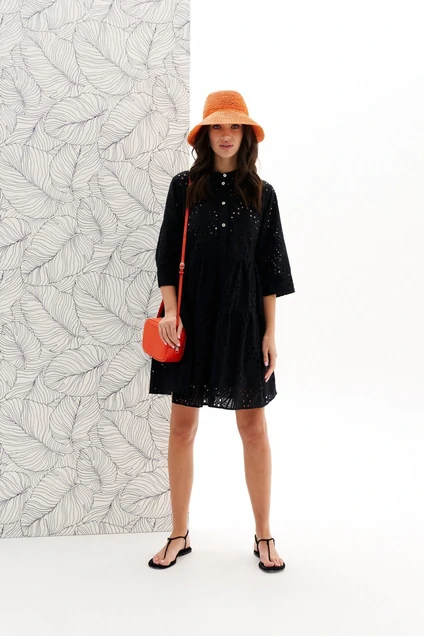 Платье женское, свободного силуэта, длиной выше линии колен из хлопковой плательно-блузочной ткани с декоративной вышивкой. Отрезное по линии талии. Перед с нагрудными вытачками, отрезной центральной планкой до подреза юбки и застежкой на петли, пуговицы. Рукав одношовный, втачной, длиной ниже линии локтя с притачной манжетой. Воротник платья - отрезная стойка. Стойка и планка из отделочной ткани. Юбка платья на подкладке. Длина 93 см, рукав 42 см.