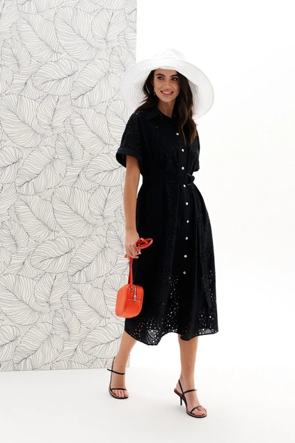 Платье женское, прямого силуэта, длиной миди из хлопковой плательно-блузочной ткани с декоративной вышивкой. Со спущенной линией плеча, цельнокроеным рукавом и притачной манжетой. Перед с притачной центральной планкой и застежкой на петли, пуговицы. Воротник рубашечный с отрезной стойкой. Планка, манжеты и воротник со стойкой из отделочной ткани. Платье на частичной отлетной подкладке. С поясом из основной ткани с пряжкой полукольцо. Длина 125 см, рукав от горловины 35 см.