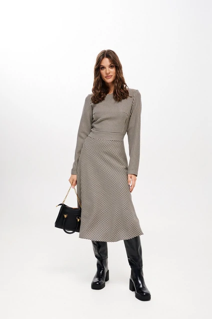 Платье женское, приталенного силуэта, длиной миди из костюмно-плательной ткани. Перед платья с отрезным поясом. Лиф переда с декоративными рельефами и нагрудными вытачками. Спинка отрезная по линии талии, со средним швом. В среднем шве спинки застежка на потайную молнию. Лиф спинки с талиевыми вытачками. Рукав втачной, одношовный, длинный. Вырез горловины круглый. Крой юбки по косой. Длина 119 см, рукав 60 см.