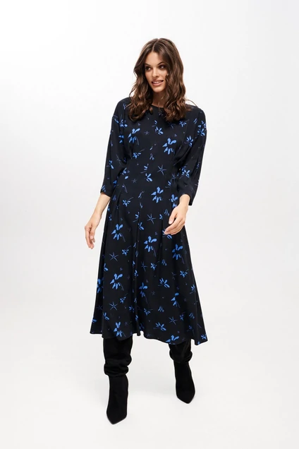 Платье женское, приталенного силуэта, длиной ниже линии колен из плательной ткани. Со спущенной линией плеча. Перед и спинка с талиевыми вытачками-складками и средним швом и складкой в нем. Застежка на потайную молнию в среднем шве спинки. Рукав три четверти с глубокой складкой по середине. Вырез горловины круглый. Длина 116 см, рукав 54 см от горловины.