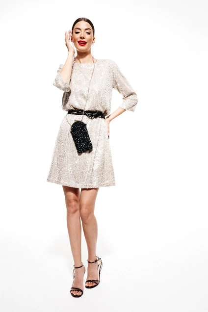 Платье женское, прямого силуэта, длиной выше линии колен, из трикотажного полотна в пайетки, на подкладке. Рукав одношовный, длиной три четверти. Вырез горловины округлой формы. В комплект входит декоративный пояс. Длина 92 см, рукав 40 см.