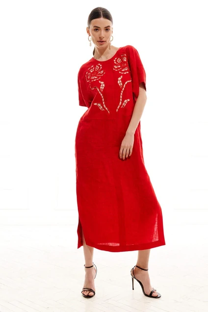 Платье женское, прямого силуэта, длиной миди из плательно-блузочной ткани, со спущенной линией плеча. Лиф переда отрезной по линии талии, со средним швом спереди. Лиф резной, центральная часть переда с декоративной вышивкой. В боковых швах функциональные карманы и глубокие разрезы. Рукав одношовный, короткий. Вырез горловины круглый, в горловине спинки имеется вырез капелька с застежкой на навесную петлю, пуговицу. длина изделия 128 см длина рукава от горловины 33 см