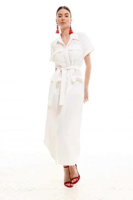 Платье женское, прямого силуэта, длиной миди из костюмно-плательной ткани. Перед с нагрудными вытачками, центральной цельнокроеной планкой с потайной застежкой на петли, пуговицы, верхними объемными накладными карманами с клапанами и нижними накладными карманами с клапанами. Спинка платья со средним швом. На боковых швах шлевки. Низ платья фигурный. Рукав одношовный, втачной, короткий, с притачной отложной манжетой. Воротник рубашечный с отрезной стойкой. В комплекте пояс из основной ткани. Длина 134 см, рукав 19 см.