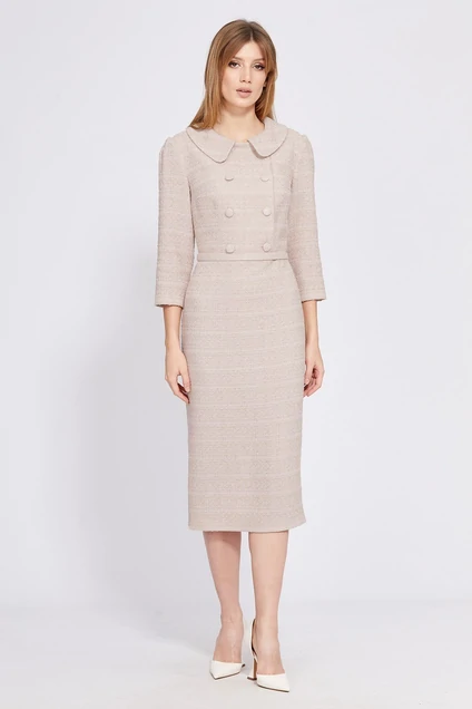Платье выполнено из твида. Платье приталленого силуэта, отрезное по линии талии, длиной миди, спереди имитация двубортной застежки на пуговицы. Застежка на потайную молнию в среднем шве спинки. Плечевой шов заужен. Рукав втачного покроя, одношовный, длиной 3/4. Разрез сзади в среднем шве. Платье на отлетной по низу подкладке. В комплект входит ремень из основной ткани, застегивающийся сзади на 3 пробивные кнопки.