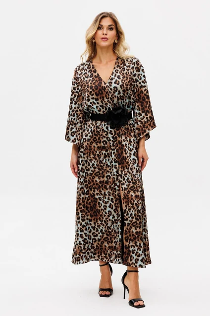Платье выполнено из атласа с анималистичным принтом. Платье Х-образного силуэта, отрезное по линии талии, длиной миди. Перед и спинка цельные. Вырез V-образной формы. Плечевой шов спущен. Рукав рубашечного покроя, одношовный, расширенный к низу, длиной 3/4. Юбка расширена к низу. Спереди в среднем шве юбки разрез. По линии талии настрочена кулиса с эластичной тесьмой. В комплект входит съемный пояс из декоративной эластичной тесьмы с цветком, застегивающийся на 2 кнопки. Платье на подкладке из атласа.