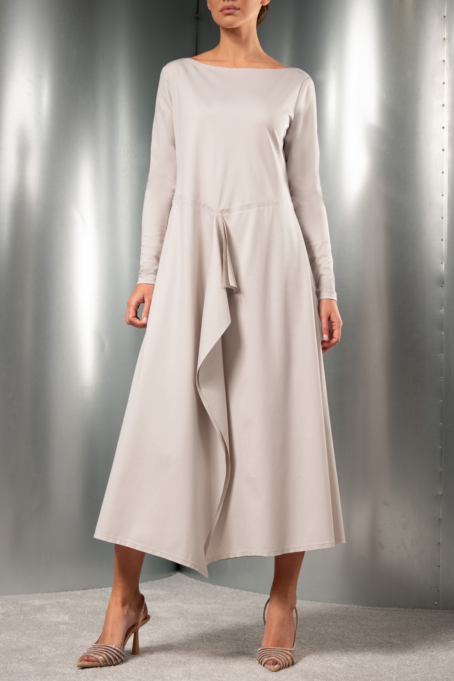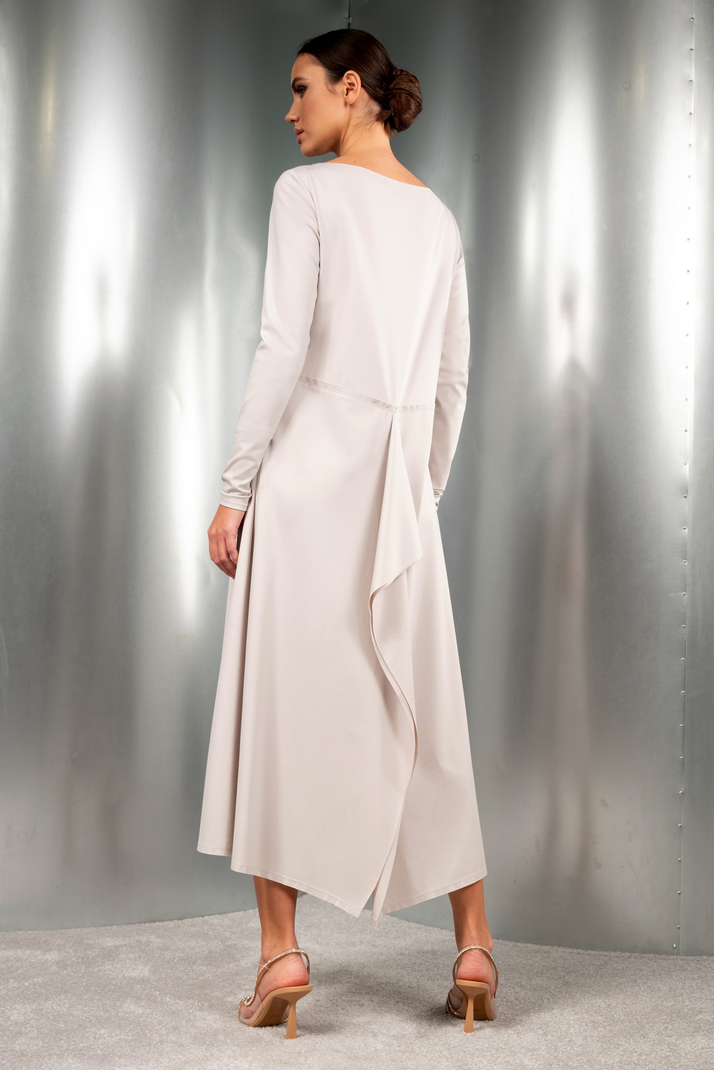 Элегантное платье в пастельно-бежевом оттенке – идеальный выбор для создания и деловых, и вечерних образов. Модель с длинными рукавами и круглым вырезом горловины обеспечивает утонченный и сдержанный вид. Особенностью данного платья является аккуратная элегантная складка по середине юбки, которая не только добавляет объем, но и делает силуэт более динамичным, подчеркивая изящество движений. Тонкий пояс на талии подчеркивает фигуру, придавая образу завершенность. Это платье станет верным выбором для женщины, ценящей стиль и комфорт.