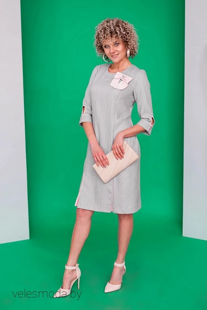 Платье женское полуприлегающего силуэта. Рукав втачнной, ¾. с манжетой. Манжета и капелька, выделенные контрастной окантовкой. Застежка - навесная петля пуговицами. По переду -рельефы. В боковом шве - карман округлой формы, выделенный контрастной окантовкой. По переду низа платья бантовые складки, также с контрастной отделкой. По спинке средний шов и талиевые вытачки. Вырез горловины округлый, обрамлен отделочной окантовкой, застежка в виде капельки с навесной петлей и пуговицей. К изделию прилагается декоративный съемный аксессуар из контрастной ткани, в цвет отделки, в виде банта с пришивными стразами. Длина рукава 42 см. Длина платья 99 см