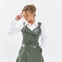 Платье женское ассиметричного кроя, полуприлегающего силуэта . По полочке изделия расположен прорезной карман с клапаном. Рукав втачной декорирован молнией. Горловина V-образная с небольшой стойкой. Застежка -молния и кнопки на планке. Низ ассиметричный. Платье на подкладке.