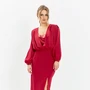 Платье женское выполнено из Велюра в романтическом стиле, изделие отрезное по линии талии. Лиф платья с отрезными кокетками по плечам и V-образным вырезом. Рукав длинный на широкой манжете по низу (застёжка пуговицы с навесными петельками). Юбка изделия А-Образного кроя. В таллиевом шве расположена резинка. В комплект входит пояс.