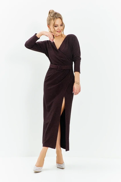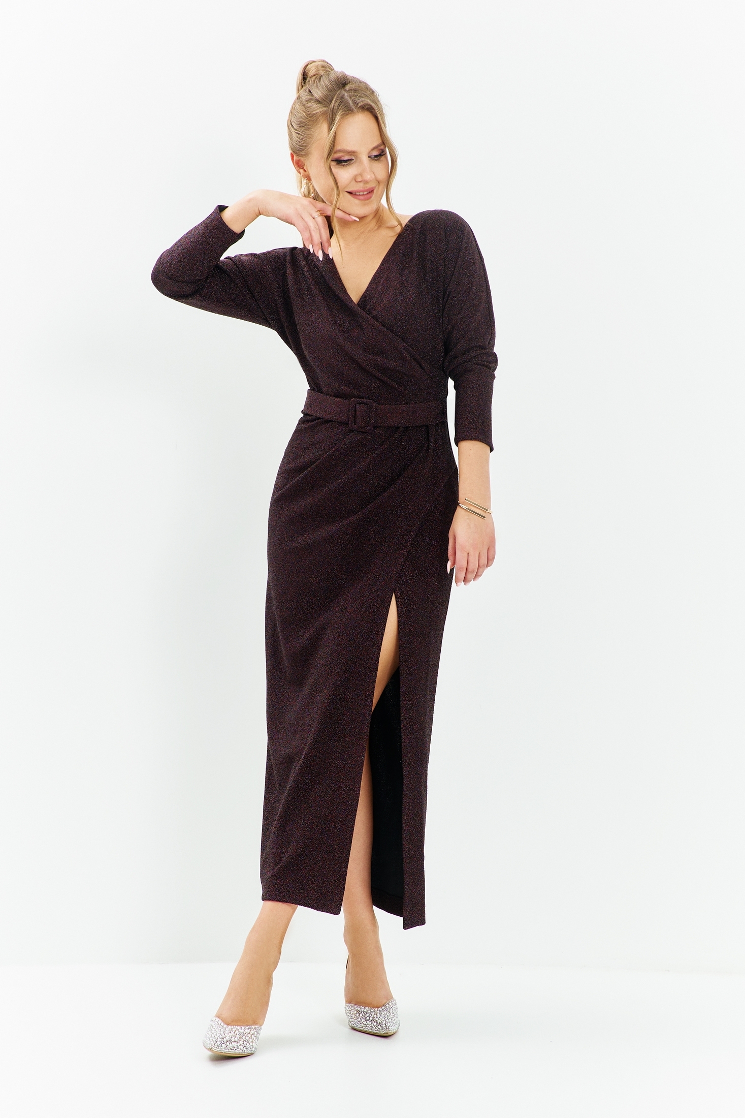 Платье женское выполнено из трикотажной ткани с люрексной нитью. Изделие прилегающего силуэта, отрезное по линии талии. Горловина V-образная, по талии изделия заложены складки наплавленные на лиф платья. Рукав "летучая мышь" низ рукава с широкой манжетой. На спинке расположена потайная молния и таллиевые вытачки. Юбка изделия с "запахом" от пояса заложены глубокие ассиметричные складки от низа изделия до линии колена находиться разрез. В комплект входит пояс с пряжкой, для подчеркивания талии