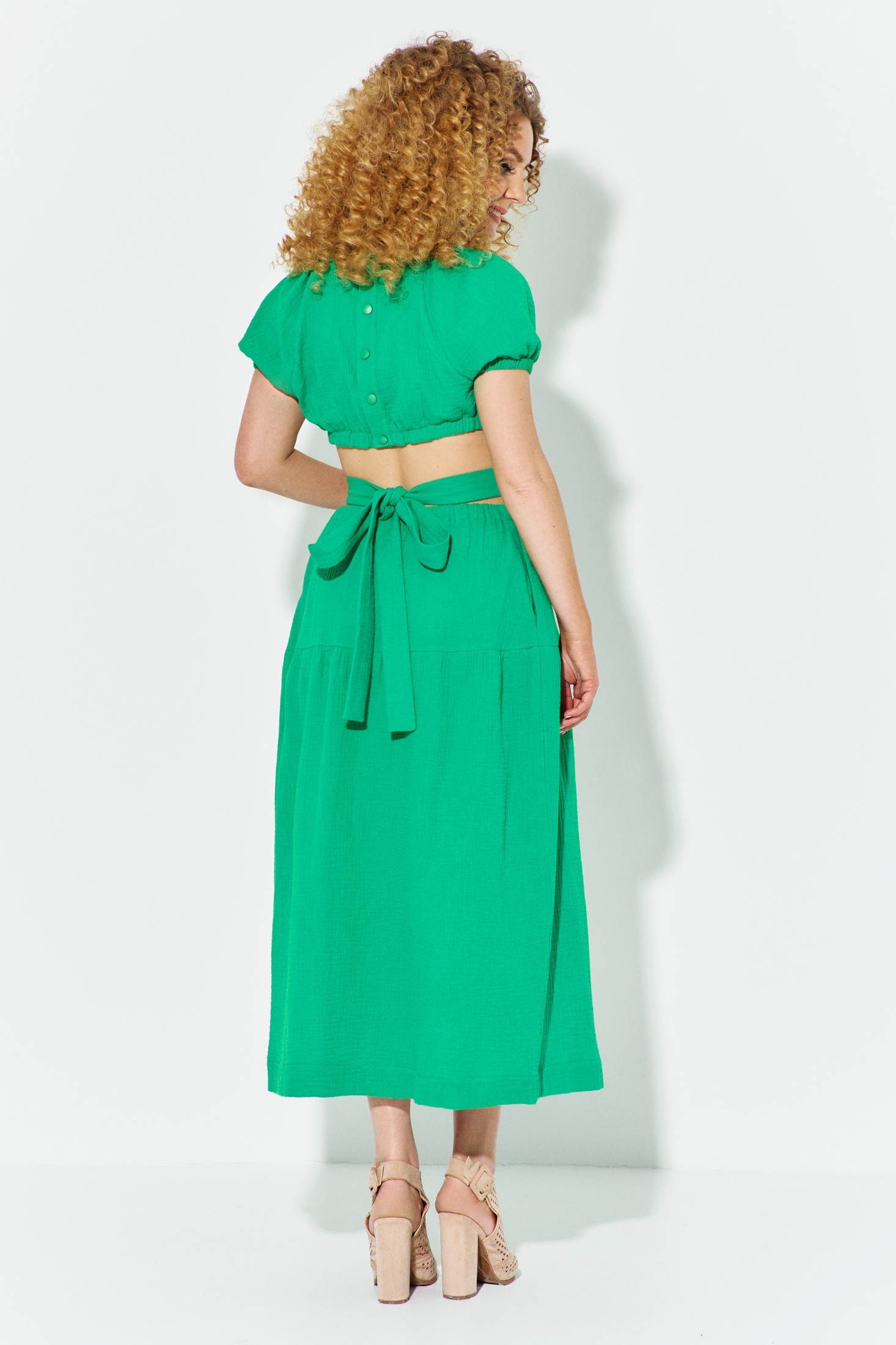 Платье 609 зеленый Euro Moda — идеальный выбор для летних дней. Коллекция бренда Euro Moda предлагает изделие из хлопкового муслина, который обеспечивает комфорт и легкость. Платье средней длины с открытой талией и резинкой на передней части делает его подходящим для повседневного ношения и отдыха. Короткий рукав-реглан с эластичной тесьмой добавляет необычности стилю. Модель включает А-образную юбку с миди длиной и отрезным воланом, а скрытые карманы в боковых швах делают его функциональным. Закругленный вырез горловины и застежка на спинке лифа придают законченный вид. Стильный зеленый цвет подчеркнет вашу индивидуальность.