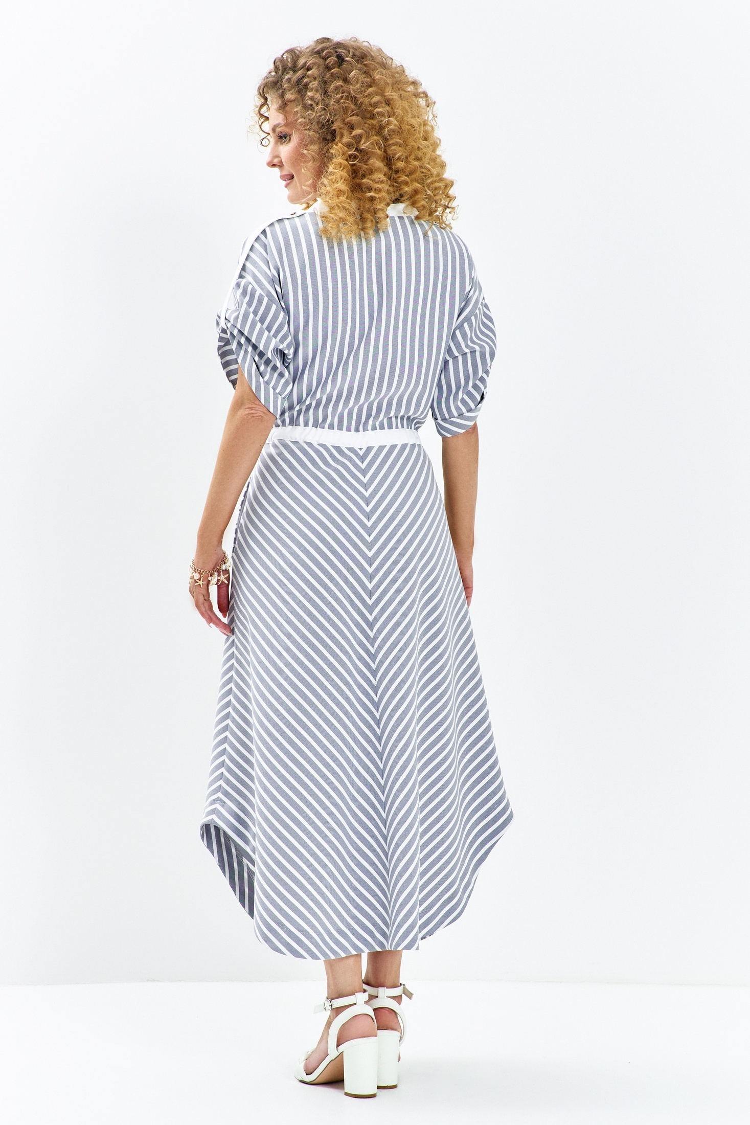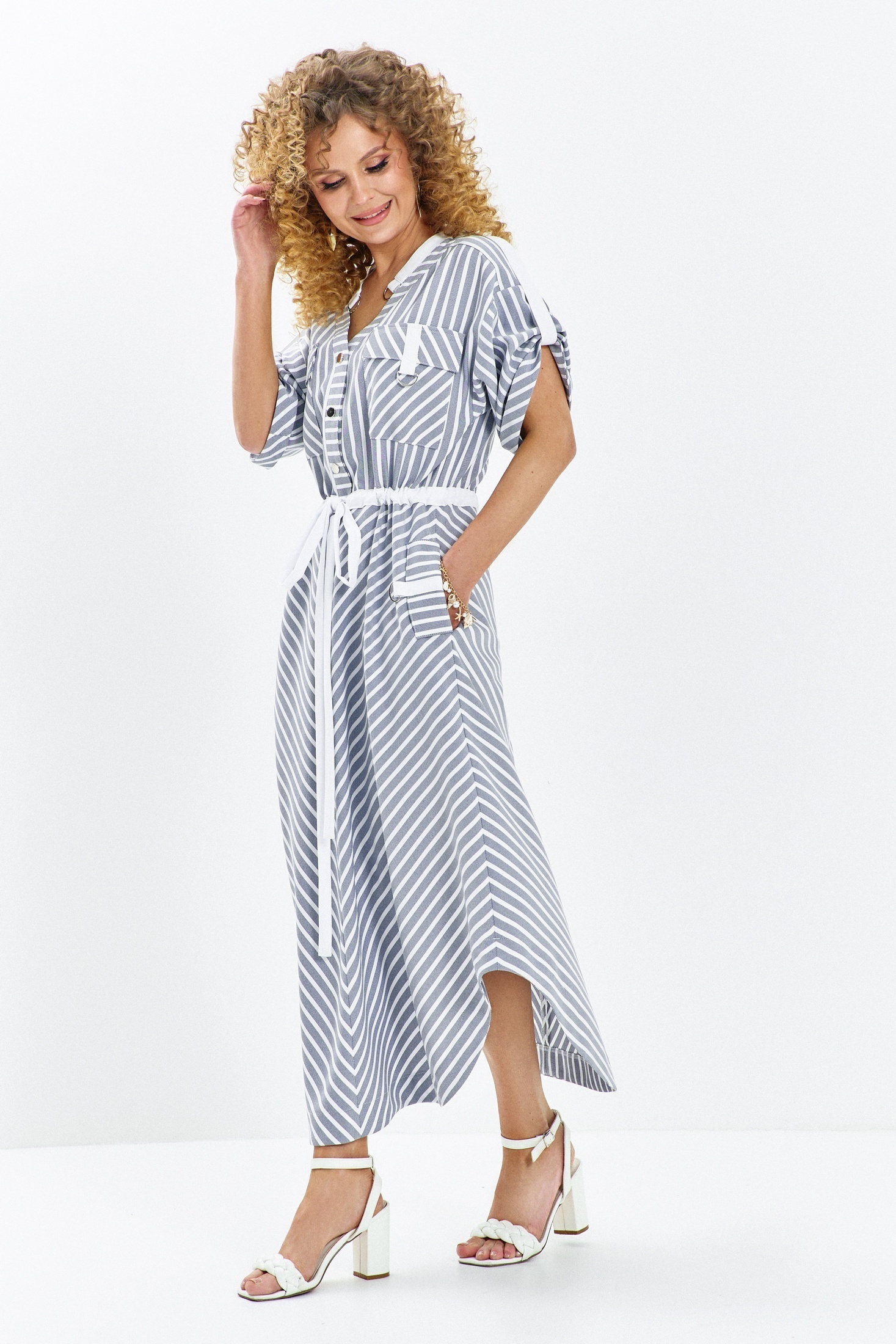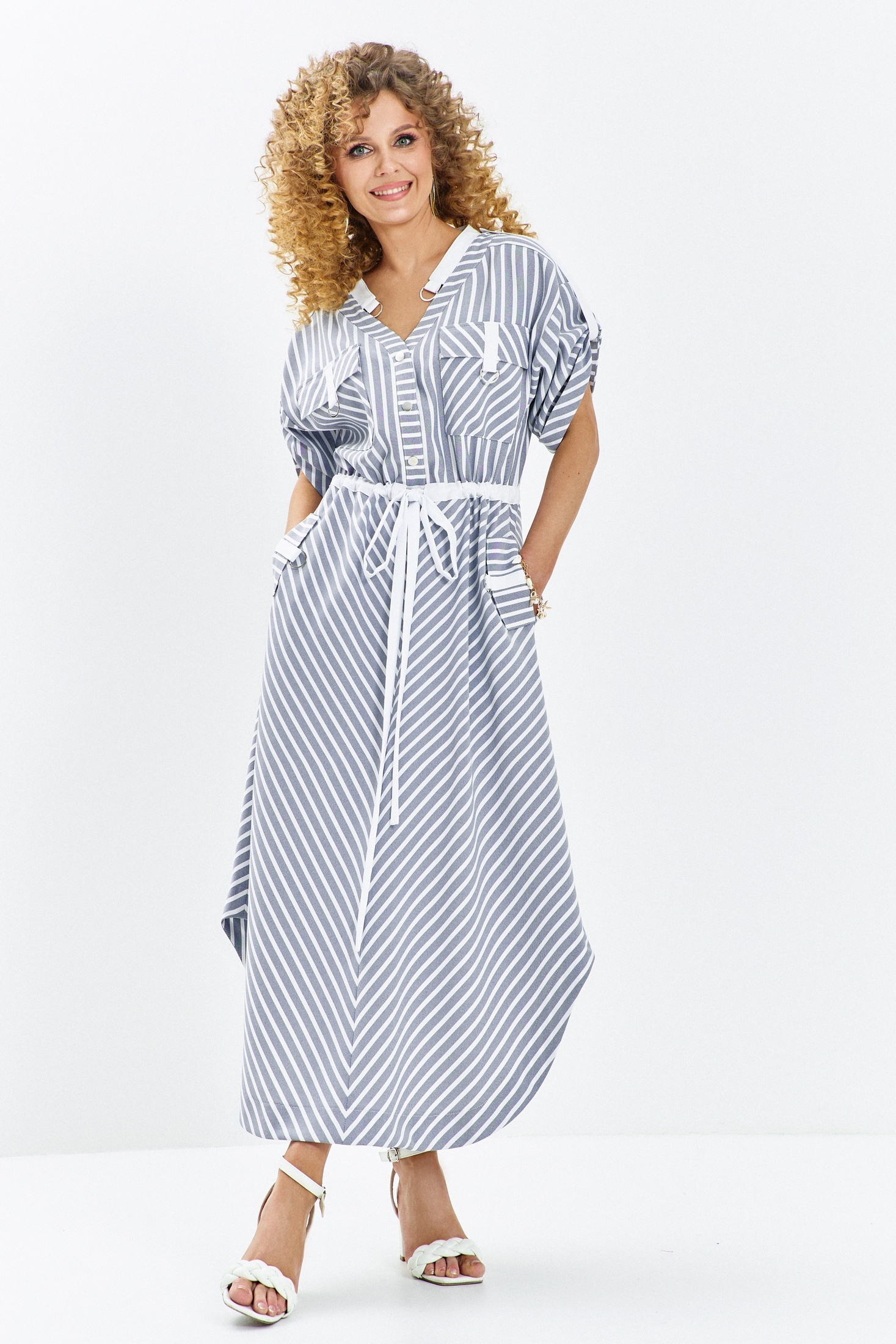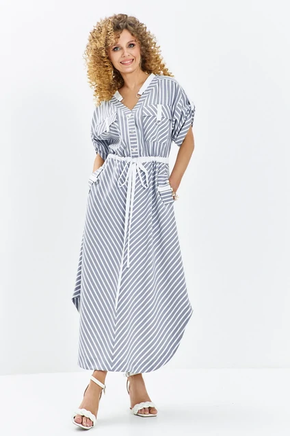 Платье 684 серо-синий Euro Moda — это стильное и универсальное решение для вашего гардероба. Коллекция бренда Euro Moda сочетает в себе комфорт и уникальный дизайн. Изготовлено из легкого полиэстера, это платье подходит для лета благодаря своей лёгкости и дышащим свойствам. Фасон свободного силуэта с акцентом на талии и разрезной юбкой создаёт элегантный, но непринуждённый вид. V-образный вырез горловины с белой отделкой придаёт изюминку, а короткие рукава с отворотами добавляют легкость. Функциональные накладные карманы с белыми клапанами и пояс-завязка обеспечивают практичность и стиль. Классический серо-голубой цвет с белыми полосками идеально подходит для повседневной носки или офисных луков.